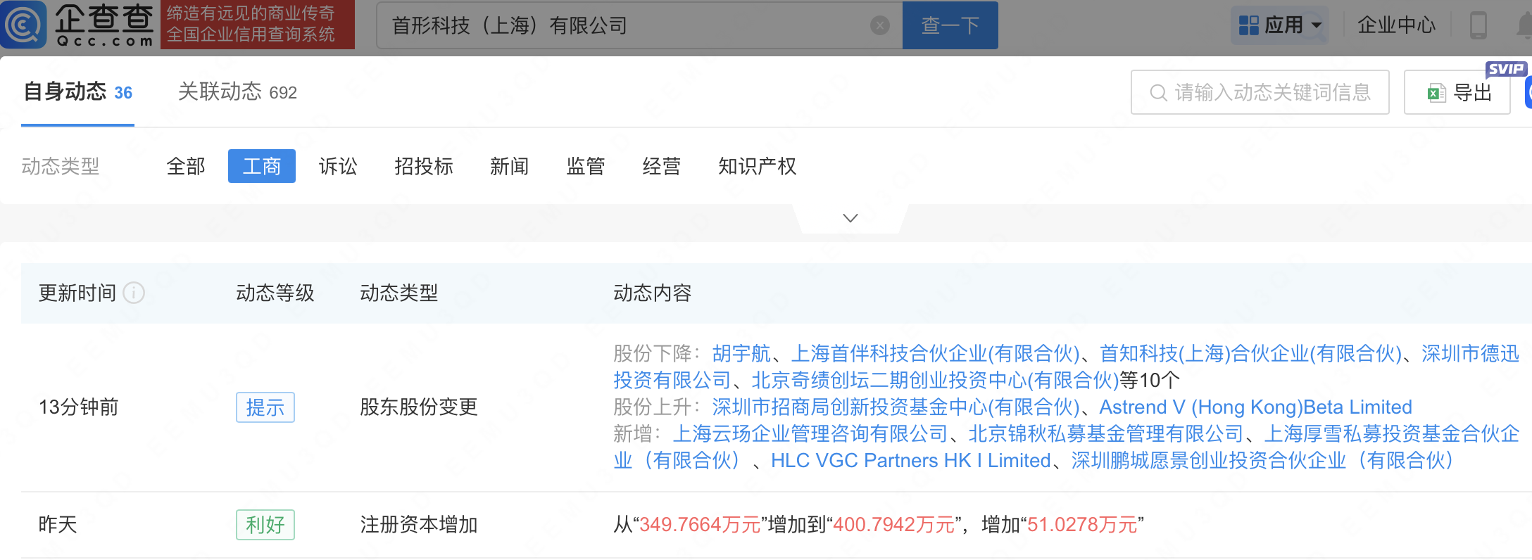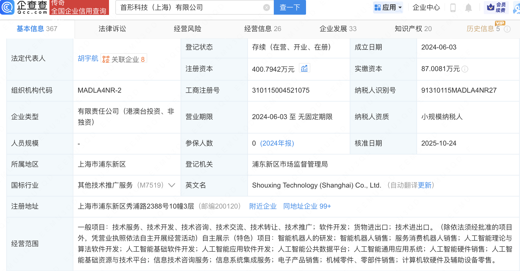近日,首形科技(上海)有限公司发生工商变更,新增蚂蚁科技集团股份有限公司全资子公司上海云玚企业管理咨询有限公司等为股东,同时注册资本增至400.79万元。企查查信息显示,该公司成立于2024年,法定代表人为胡宇航垒富配资,经营范围包含:智能机器人的研发;智能机器人销售;人工智能理论与算法软件开发;人工智能基础软件开发等。公开信息显示,首形科技是一家专注于高端、超仿生仿人机器人研发的企业,旨在为市场提供具有高度拟人化特征的机器人产品。