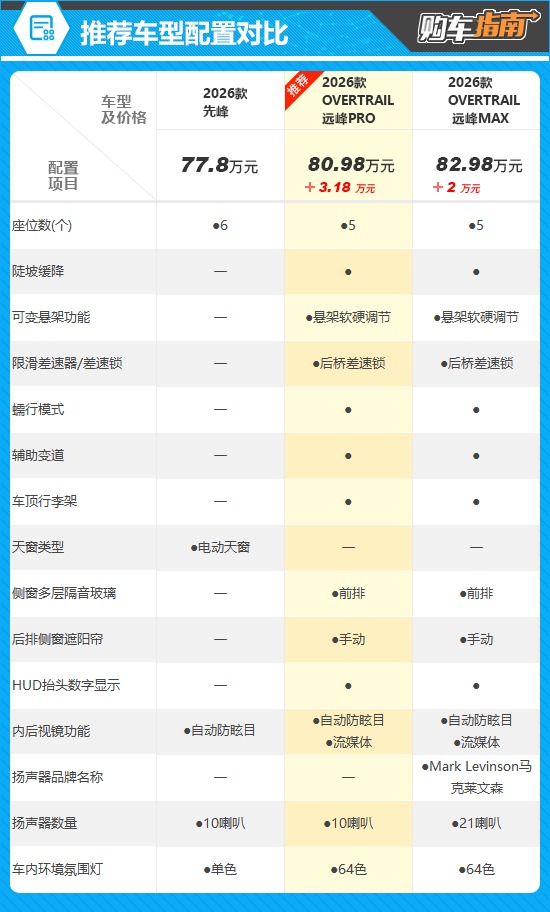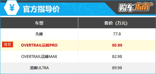目前在售的4款配置车型中,OVERTRAIL远峰PRO最值得推荐。相比入门版车型,推荐车型虽然少了电动天窗,但在驾驶操控和四驱/越野配置方面有明显提升,如增加后桥差速锁、悬架软硬调节、陡坡缓降和蠕行模式等。虽然价格高出3.18万元,但车辆的动态性能有明显提升,绝对是物有所值。