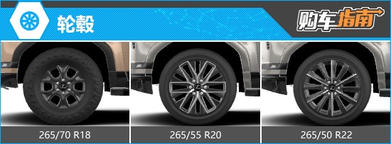 轮毂方面,新车提供三种尺寸可选。其中期配宝,18英寸轮毂为两款OVERTRAIL车型专属,采用哑光黑涂装,匹配规格为265/70 R18的全地形轮胎;入门车型搭载20英寸轮毂,匹配规格为265/55 R20的轮胎;22英寸轮毂为顶配独享,采用多辐设计,匹配规格为265/50 R22轮胎。