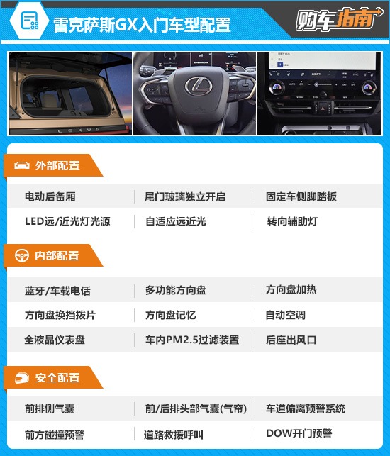 2026款雷克萨斯GX的入门车型为先峰,配置方面整体表现尚可,如配备了电动后备厢、尾门玻璃独立开启、自动空调、后座出风口等日常经常用到的功能;同时,在安全配置方面,还提供了前/后排头部气囊(气帘)、前排侧气囊、车道偏离预警系统等。之所以不做重点推荐,主要原因是其在四驱/越野配置和驾驶操控配置方面存在一定缺失。