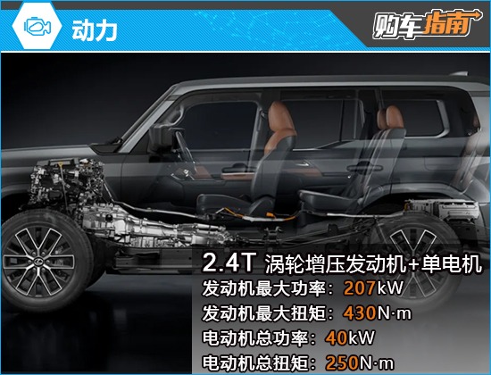 动力方面,新车搭载2.4T涡轮增压发动机与电机组成的混合动力系统,发动机最大功率207kW、最大扭矩430N·m;电动机总功率40kW、总扭矩250N·m;匹配8挡手自一体变速箱,并配备全时四驱系统。